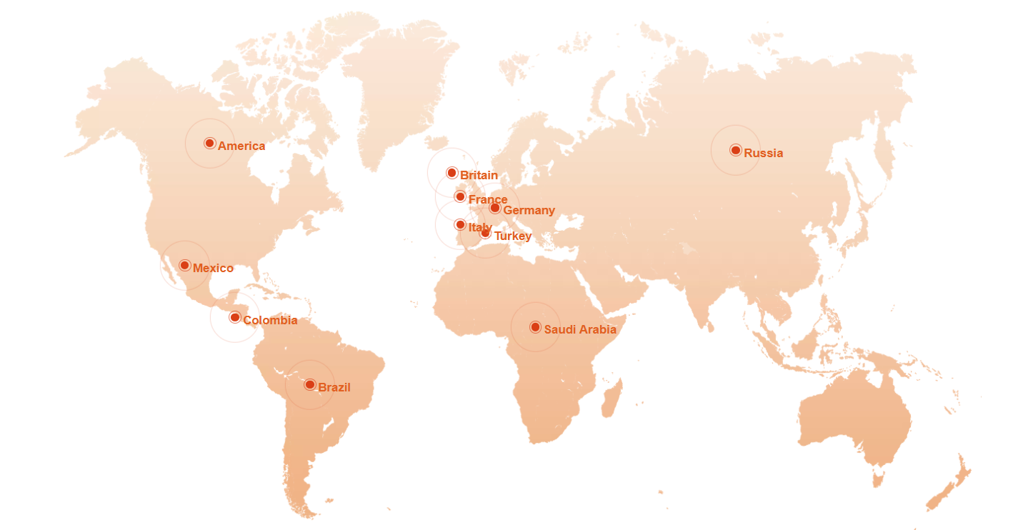 Our products reach North America, South America, Eastern Europe, Southeast Asia, Oceania, the Mid East, Eastern Asia, Western Europe, Central America, and the Domestic Market