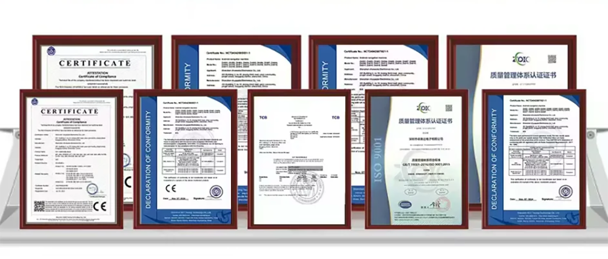 With strong engineering capabilities and a project-driven approach, we deliver safe, stable, and highly compatible car head unit systems that meet international standards. Our manufacturing and quality management systems are certified to ISO 9001, ISO 14001, ISO 45001, and are also compliant with key industry certifications such as CCC, CE, FCC, RoHS, E-MARK, and C-Tick, ensuring consistent product quality, environmental responsibility, and occupational safety across all production lines.